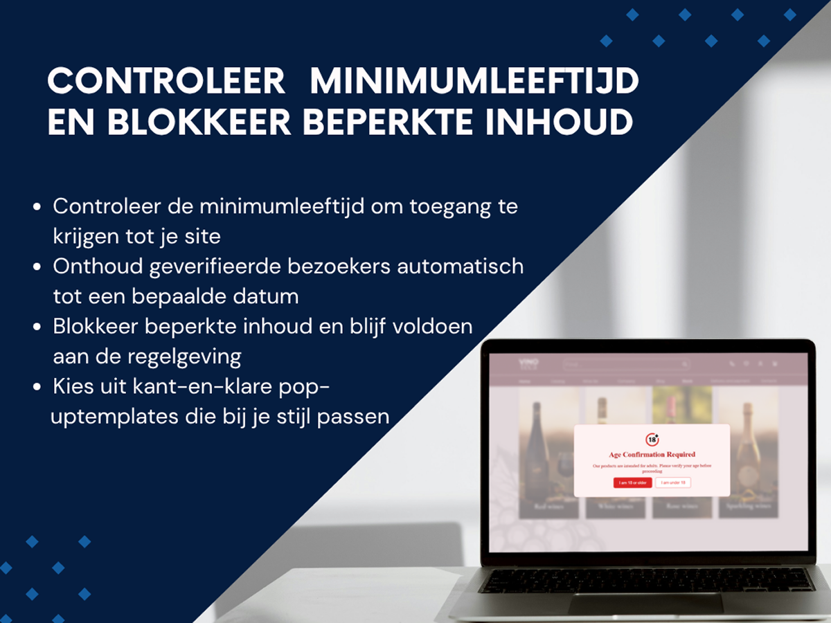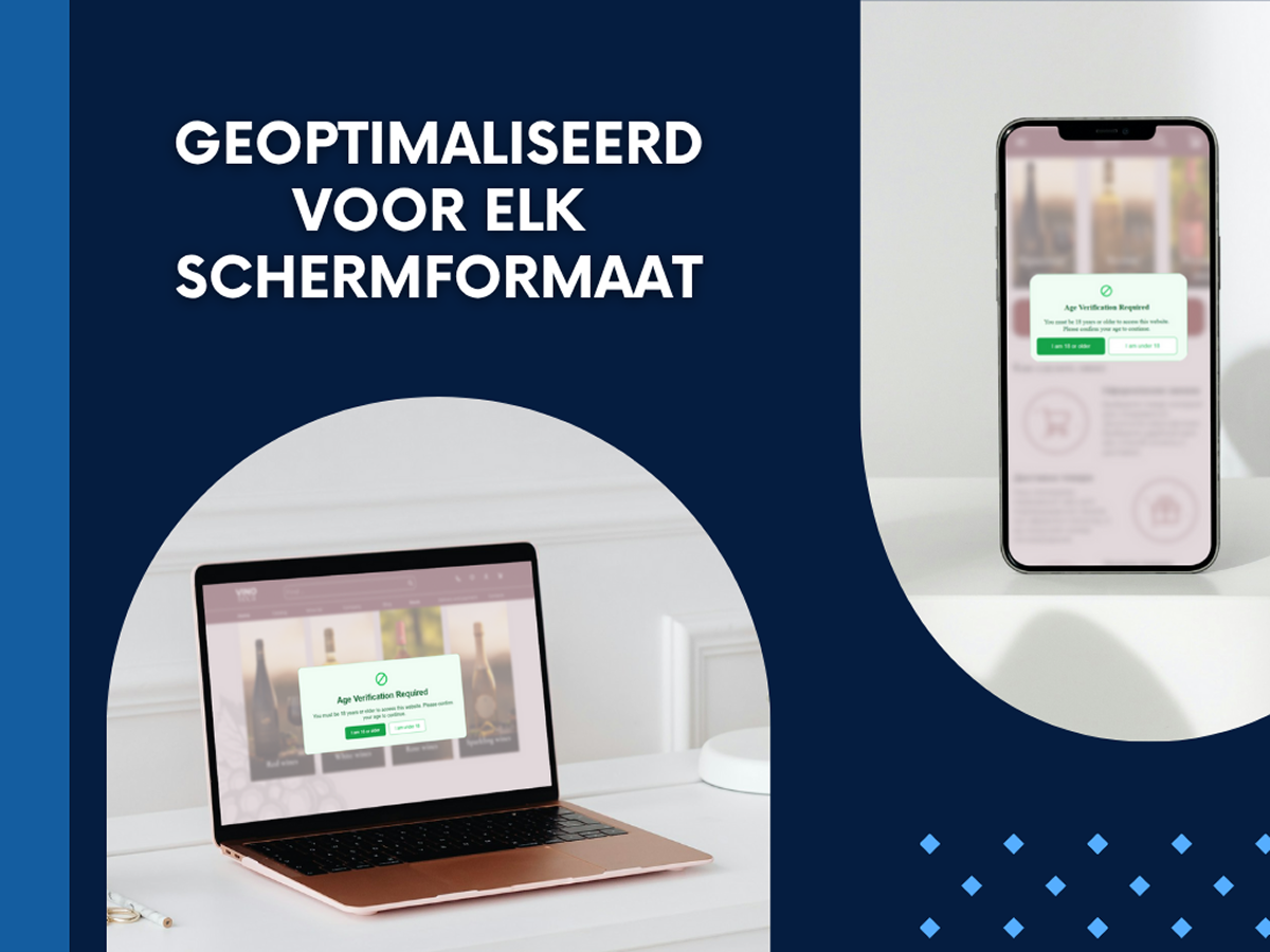 Zorg ervoor dat je website de toegang tot leeftijdsgebonden inhoud beperkt met een intuïtieve leeftijdsverificatiepop-up. Stel leeftijdsgrenzen in zoals 18+, 21+ of een aangepast minimum om eenvoudig te voldoen aan wettelijke vereisten. Kies uit kant-en-klare sjablonen die bij je stijl passen, met de optie om je logo toe te voegen voor een persoonlijke touch.
