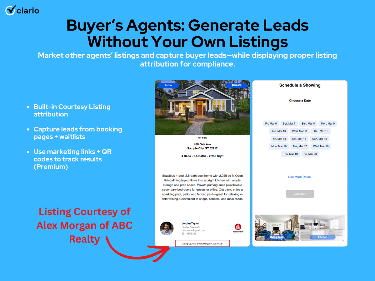 Buyer’s agents: Promote any property confidently with a required attribution/credit line—ideal when advertising another agent’s or brokerage’s listing. Convert marketing into real showing requests while capturing buyer details automatically, so you can follow up fast and stay in control of the relationship.