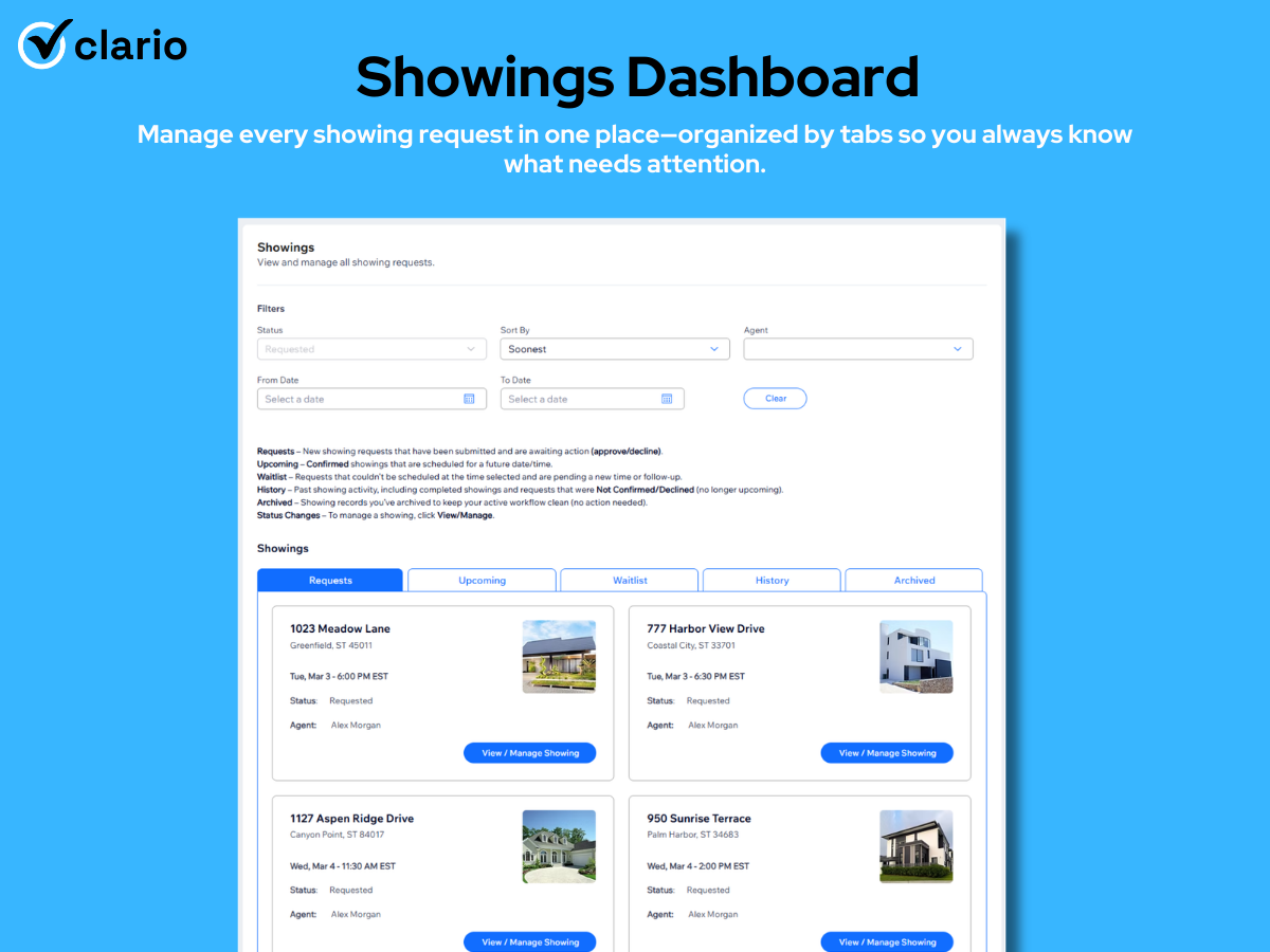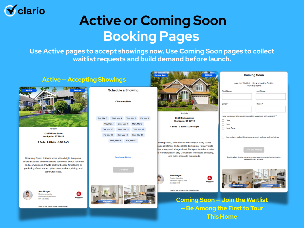 Listing agents: Real Estate Showing Scheduler turns your listings into a 24/7 lead-capture and showing-request machine. Send one link and let buyers request a time instantly while your branding stays front and center. Keep scheduling clean with blackout rules, prep/travel buffers, and max bookings per time slot (allow multiple requests for the same start time when you choose). Route requests with multi-agent assignment, collect leads on Coming Soon listings with a waitlist flow, and even create a branded booking page before the listing goes live for your listing presentation.