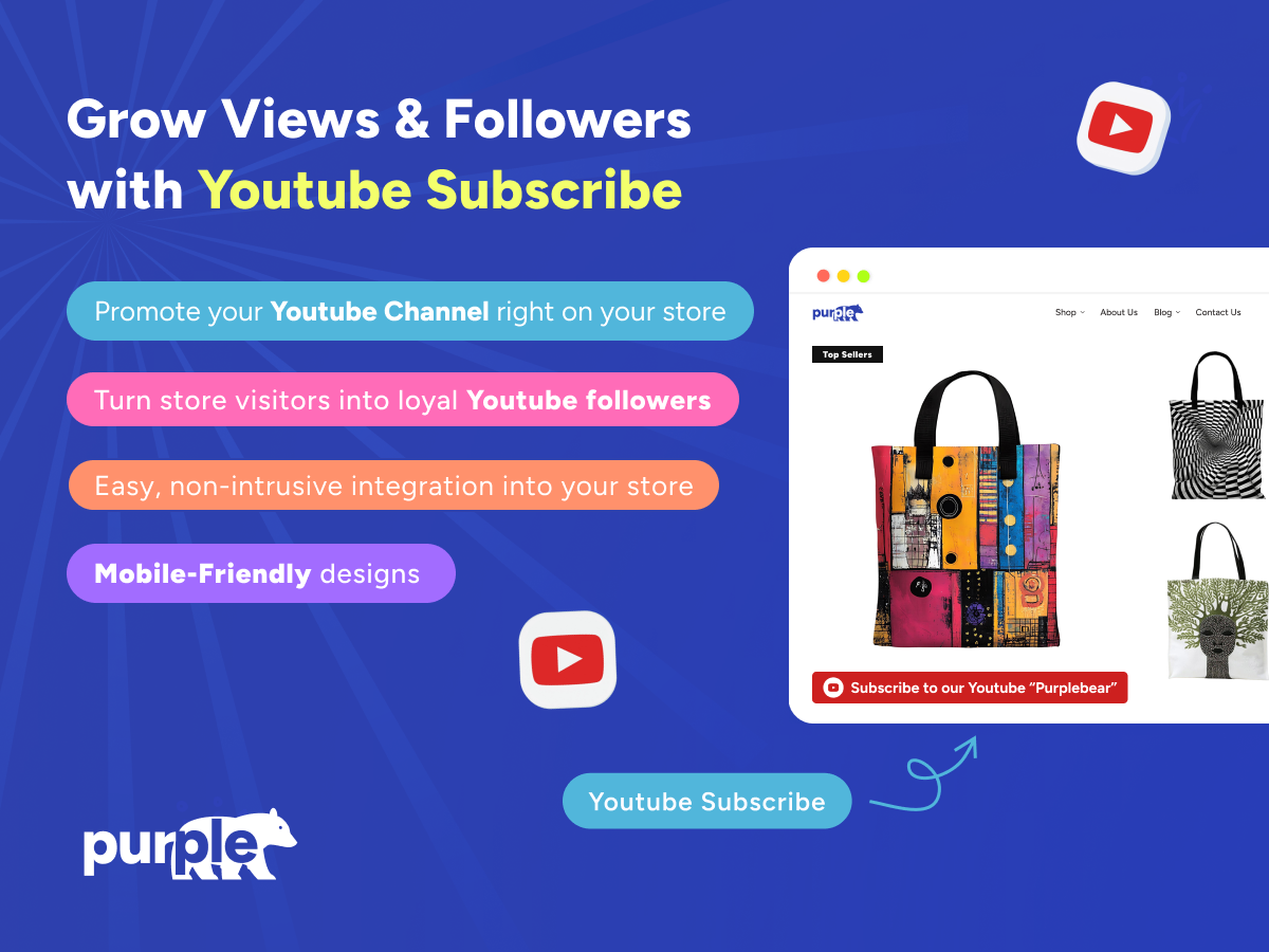 Promoot je YouTube-kanaal moeiteloos met de YouTube Subscribe-app. Voeg een strak, aanpasbare widget toe aan je winkel die shoppers uitnodigt om met slechts één klik te abonneren. Of je nu tutorials, productdemonstraties of merkverhalen deelt, deze tool helpt je om je videopubliek te laten groeien zonder de winkelervaring te verstoren.